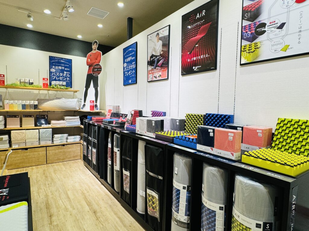 大谷翔平選手と実際に大谷選手も使用している「AiRマットレス」とともに迎えてくれる店舗正面。