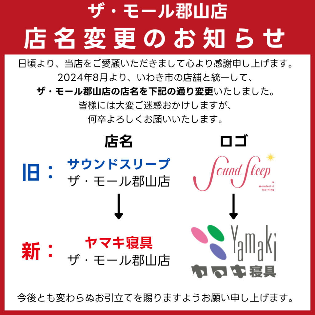ホームお知らせお知らせ【重要】店名変更のお知らせ(ザ・モール郡山店) 2024.08.02 お知らせ 【重要】店名変更のお知らせ(ザ・モール郡山店) 日頃より、当店をご愛顧いただきまして心より感謝申し上げます。 2024年8月より、いわき市の店舗と統一して、ザ・モール郡山店の店名を下記の通り変更いたしました。 皆様には大変ご迷惑おかけしますが、何卒よろしくお願いいたします。 次の記事 一覧に戻る 前の記事
