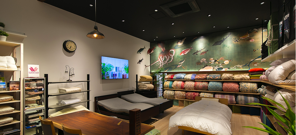 大谷石を使った重厚な造りの蔵は「ねむりの相談所」として生まれ変わり、店舗内には江戸中期の画家伊藤若冲(じゃくちゅう)の描いた海の生物の絵を配置。港町の雰囲気を感じさせる役目を果たしています。