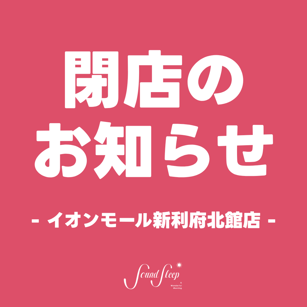 ホームお知らせお知らせ【イオンモール新利府 北館店】閉店のお知らせ 2026.03.29 お知らせ 【イオンモール新利府 北館店】閉店のお知らせ 日頃より、サウンドスリープをご利用いただき誠にありがとうございます。 サウンドスリープ イオンモール新利府 北館店は、 2026年3月29日(日)をもちまして閉店いたします。 これまでのご愛顧に心より御礼申し上げますとともに、 閉店によりご不便をおかけいたしますことをお詫び申し上げます。 ⸻ なお、当区画には春より 「nishikawa直営店舗」がオープン予定です。 オーダー枕のメンテナンスにつきましては、 オープン後の同店舗にて引き続き承ります。 一覧に戻る 前の記事