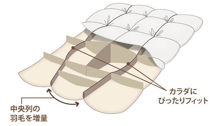 羽毛ふとんの暖かさを長く保つには、「キルト」も重要です。キルトによって羽毛が片寄り、暖かさにムラが出ることがあります。片寄りにくい工夫があるキルトなら、長く使っても暖かさが均一で快適さが続きます。さらに身体のラインに沿うキルトは、すき間を減らしてフィット感も高めてくれます。ヤマキ寝具では、羽毛が片寄りにくさやフィット感のあるキルトにこだわって選んでいます。