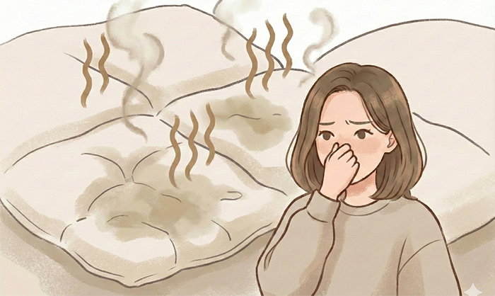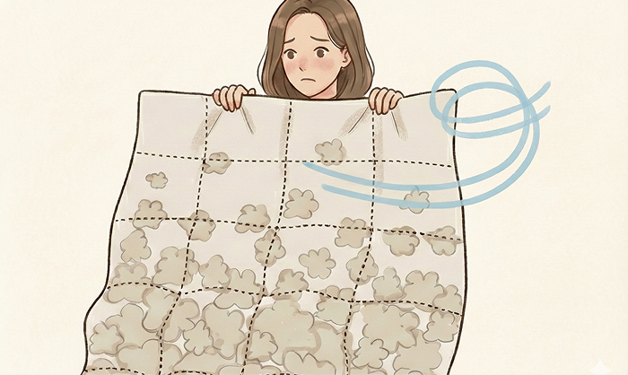 「真ん中だけ薄い」「暖かさにムラがある」などは、羽毛の片寄りが起きているサインかもしれません。片寄りが進むと、保温力だけでなく掛け心地も変わり、違和感につながることがあります。