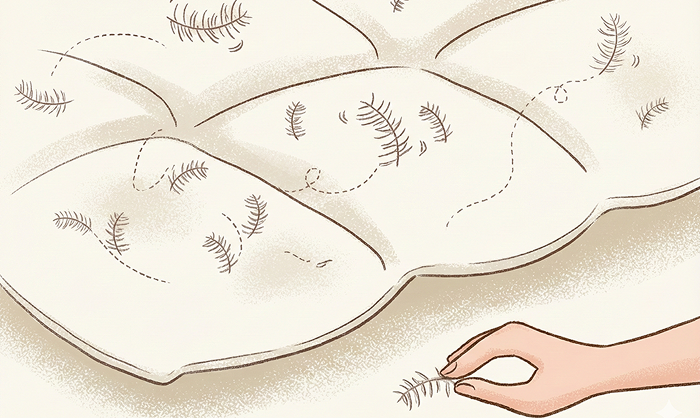 羽毛が出てくるのは、側生地が痛んでいる可能性があります。 放置すると羽毛がさらに抜けてボリュームが落ち、細かな羽毛が舞って吸い込みやすくなることも。小さな抜けでも早めにご相談いただくと、状態に合わせた最適なご提案がしやすくなります。